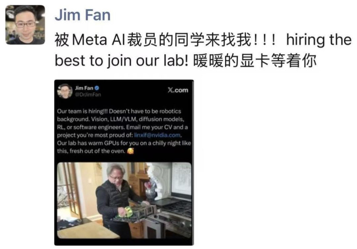 英伟达Jim Fan也在朋友圈招募,「被Meta AI裁员同学来找我!!! 暖暖的显卡等着你」。