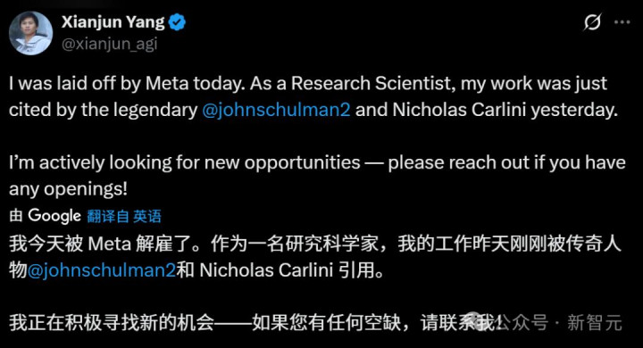 就连FAIR的AI大牛田渊栋,也在裁员之列。