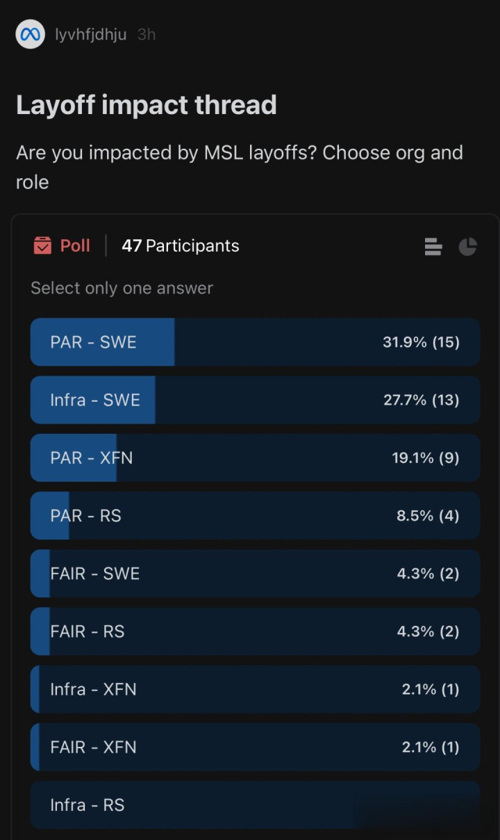 简单计算得知,FAIR的裁员比例约5%,而PAR和Infra两部门裁员比例高达约27%!